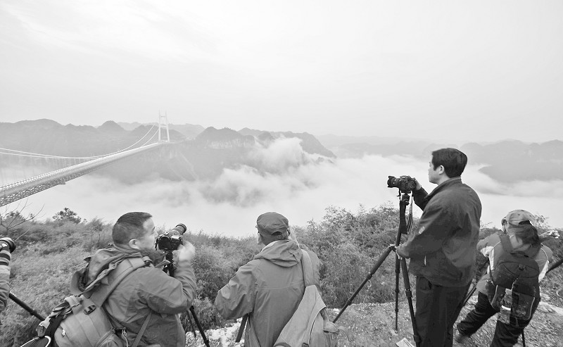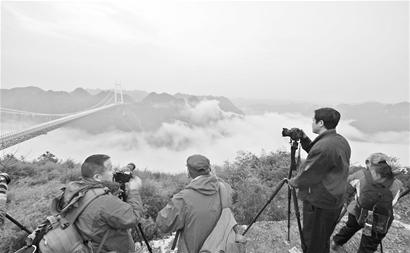 3月31日,几位摄影爱好者在矮寨特大悬索桥一侧的山顶拍摄。