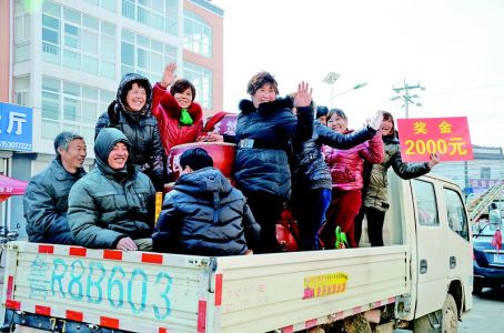 领到奖金的王菜园村代表队高兴地“满载而归”汇演现场,观看表演的人们比肩接踵