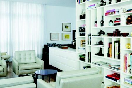 ②公寓里设计的小图书馆体现了主人的品味,琳琅满目的书籍显示了这里收纳的空间之大,而墙边的沙发则增加了阅读时的舒适感。