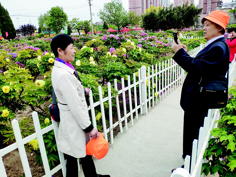 4月21日,曹州百花园内游客在晚期牡丹品种前合影留念。据曹州百花园负责人介绍,目前,绿幕隐玉、雪中笑、紫羽傲阳、百园霞光、海黄、幕春红等90余个中晚期牡丹品种正陆续进入盛花期,预计花期可以持续到“五一”前后。“五一”假期期间,园内10万株芍药也将竞相开放,预计芍药花期可以持续到5月底。20日、21日周末,菏泽各牡丹园累计接待游客超过15万人,其中半数为外地赏花客。