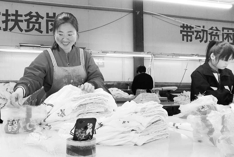 4月17日,郓城县张鲁集镇董庄村村民胡桂菊在李庄扶贫车间为出口订单服装成品穿插商标吊牌。“俺家里有两个上学读书的孩子,实在是不能外出打工。”胡桂菊笑着说,“这两年家门口建了服装厂,俺一个月也快挣到3000元了!”