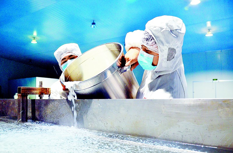 ◆5月18日,在牡丹区安兴镇返乡创业园锦臻食品车间内,工人们正在生产加工饮料爆爆珠。该公司负责人杨玉停是安兴镇本地人,在上海打拼20年后,去年回乡创业,投资兴办食品加工厂,目前已安置就业60余人,年产值200多万元,有效带动当地群众脱贫增收。