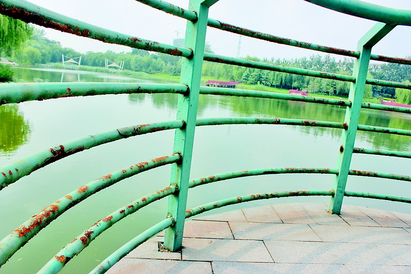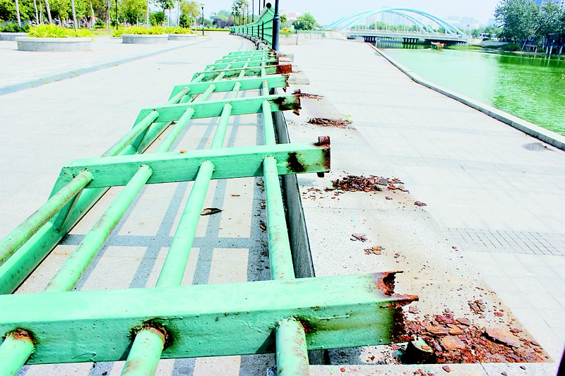牡丹晚报记者调查发现,市永昌路与天香路交叉口至李荣海美术馆的赵王河公园观景平台护栏锈迹斑斑,有几段已经“缺胳膊少腿”,还有两段的栏杆已经严重变形。同样,市八一路与天香路交叉口西北角的沿河护栏也是锈迹斑斑,根部腐蚀状况更加严重。
