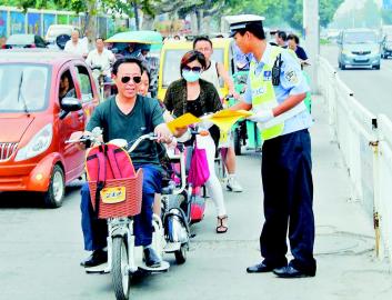 8月30日上午,市交警支队市区大队民警在市人民路和牡丹路路口,开展非机动车和行人交通违法行为专项治理工作,向过往行人发放非机动车、行人交通违法治理宣传单,讲解违规行驶的危害性,并提醒大家一定要文明出行,争做文明交通的实践者,共同营造良好道路交通环境。张 莉 摄