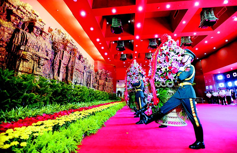 9月3日,中国人民抗日战争暨世界反法西斯战争胜利69周年纪念活动在北京中国人民抗日战争纪念馆举行,首都各界向抗战烈士敬献花篮。图为礼兵在敬献花篮。