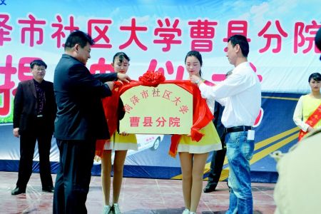 4月15日,菏泽市社区大学曹县分院正式揭牌。菏泽市社区大学校长、菏泽信息工程学校校长马飞与曹县万顺驾校校长谢志坚共同为“菏泽市社区大学曹县分院”揭牌,社区大学副校长、信息工程学校副校长李振华向谢志坚颁发“菏泽市社区大学曹县分院院长”聘书。据介绍,曹县分院成立后,将致力于构建终身教育体系,推动全民学习,建设学习型城市;适龄学员进入驾校学习,既可以考取机动车驾驶证,又可以获得国家承认的中专学历。 记者 朱 静 摄