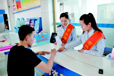 为方便营改增纳税人填写涉税表格,郓城县国税局在办税服务厅设立营改增辅导填表专用窗口。图为该局办税服务厅窗口人员辅导营改增纳税人填写委托划转税款三方协议书。