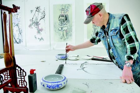 昨日,记者走进张研的画室,一张宣纸已铺在画案上,他正在案边踱步沉思。随后,提笔作画一气呵成,一幅花鸟图跃然纸上。