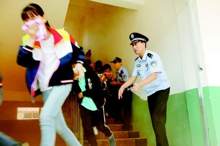 近日,曹县公安局梁堤头派出所民警来到辖区中学,向学生们讲解防震减灾自护自救知识,并举行模拟地震、火灾等自然灾害的紧急疏散演练,增强了师生安全风险防范意识,提升了应急避险和自救互救能力。图为民警指导孩子们逃生自救。