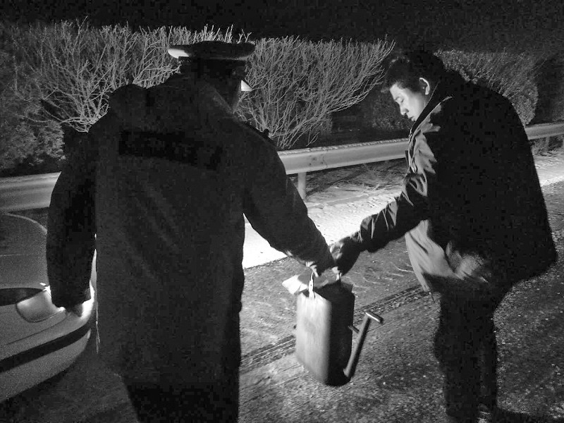 曹玉峰上前询问,得知轻型货车没了燃油受困高速,车主愁眉不展。此处离收费站还有10多公里,因大雪天气高速封闭,地方车辆无法上高速为其送油。