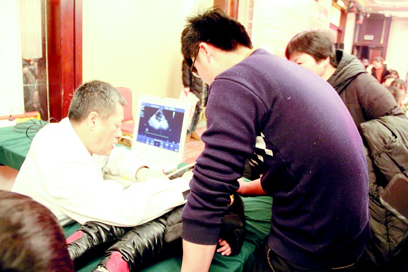 在活动现场,张洪彬为前来参加活动先心病患儿进行复查义诊。