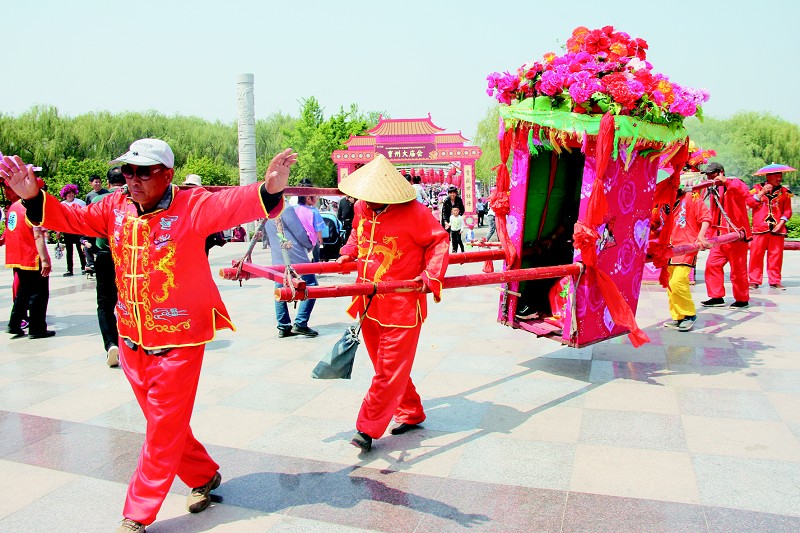 4月20日,在曹州牡丹园国花魂广场,两顶花轿并排放在地上,每当有游客近前要坐轿,几名轿夫便立刻精神抖擞地站起来,把轿杆放在肩膀上,伴随着唢呐和笙的演奏,踏着步子跟随音乐的节奏摇晃起来。有时,他们还颠轿,坐轿者紧紧地抓住扶手,被颠得前仰后合却又喜笑颜开。